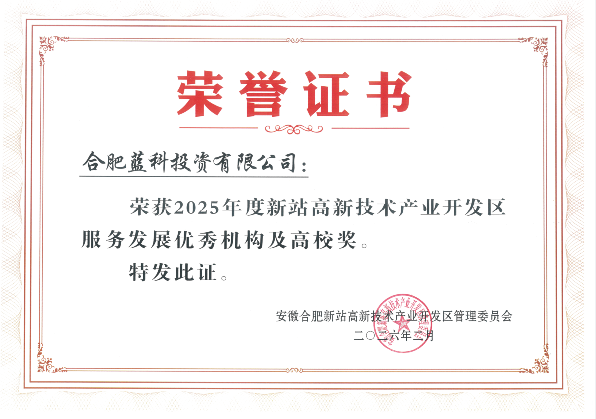 2月26日,合肥新站高新区召开2026年工作会议,会上对2025年度为区域发展作出杰出贡献的企业进行了表彰。合肥蓝科投资有限公司凭借其在区域内推动重大项目落地、优化营商服务环境等方面的突出表现,一举斩获新站高新区“2025年度优秀服务企业奖”与“2025年服务发展优秀机构及高校奖”两项殊荣;同时,合肥蓝科所属子公司合肥科城产业投资有限公司荣获新站高新区“2025年度投资贡献奖”。